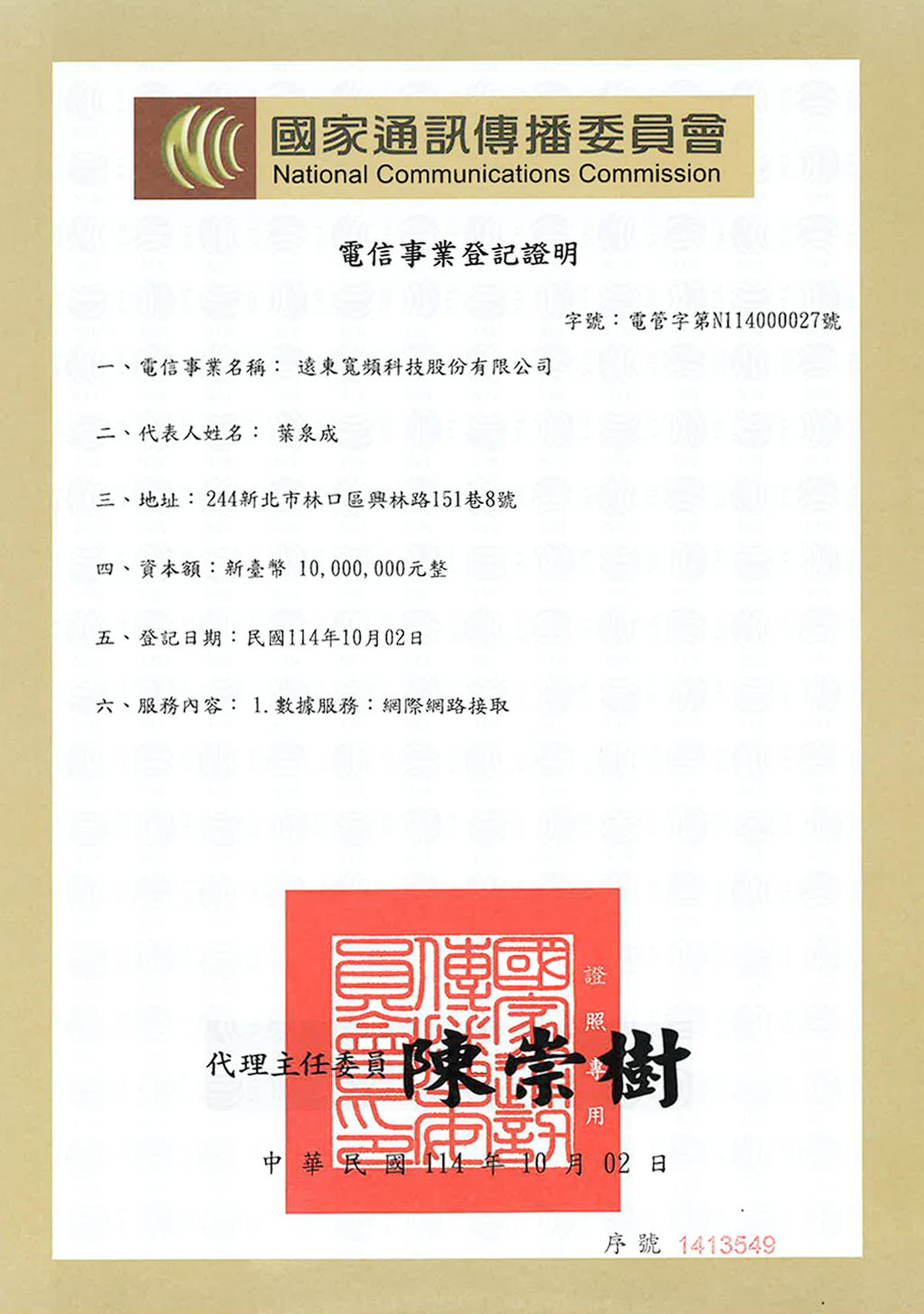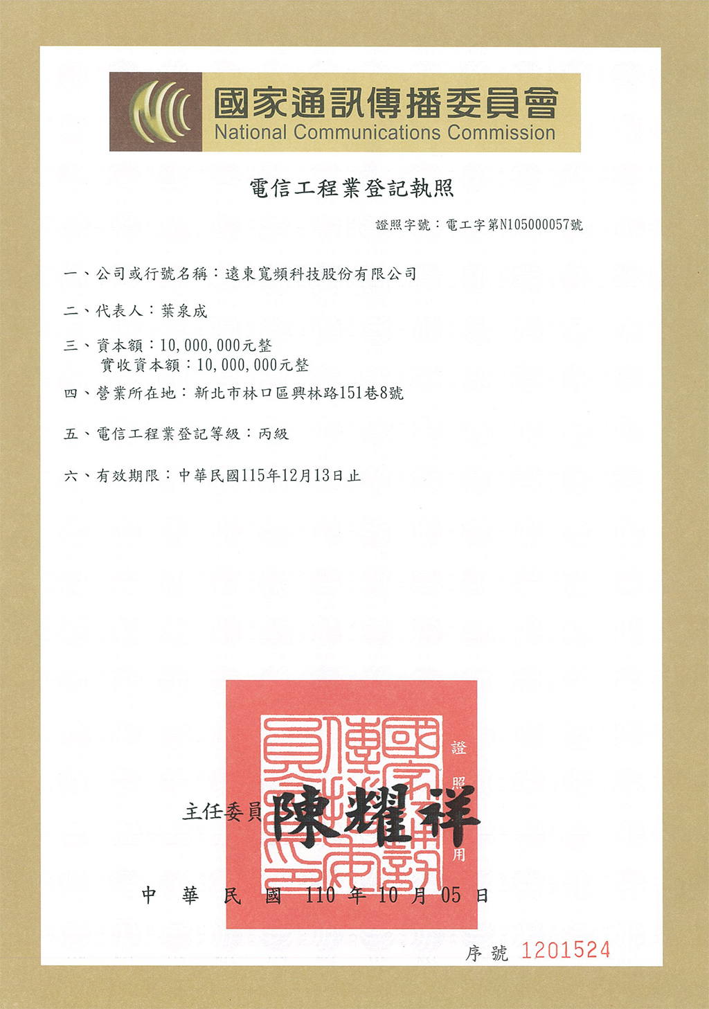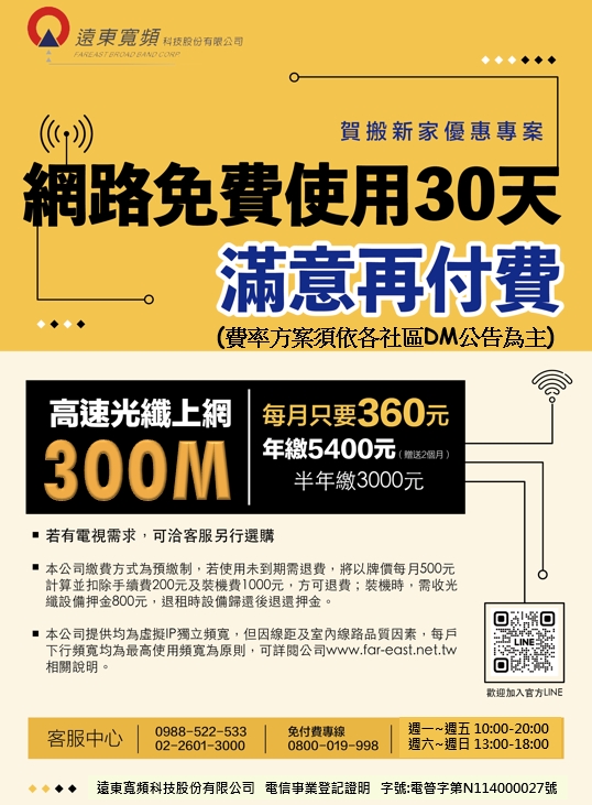取得NCC電信事業及工程執照,具備雙重認證合法經營併受政府監管,用戶使用網路更安心,遠東寬頻比您更在乎社區用戶的權益。